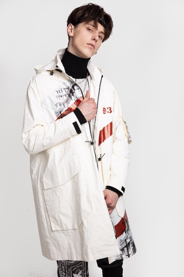 主題下分為三個(gè)系列,第一個(gè)系列是情報(bào)系列,也是特色系列。為此我專(zhuān)門(mén)去上圖查閱了新民晚報(bào)在建國(guó)后的期刊,搜集創(chuàng)作素材,結(jié)合over size的潮流設(shè)計(jì)了報(bào)紙素材拼貼襯衫,紙質(zhì)肌理的老上海街景燙畫(huà)輕質(zhì)風(fēng)衣等。第二個(gè)系列是霓虹系列,靈感來(lái)源于百樂(lè)門(mén),南京路的夜景,因?yàn)橐股钍枪沤裆虾W罹叽硇缘姆?hào)之一,主要通過(guò)解構(gòu)主義印花的方式呈現(xiàn)。第三個(gè)系列是夜光系列,靈感來(lái)源于梅雨季節(jié)的路面星光,燈紅酒綠支離破碎的倒影,主要以各類(lèi)熒光色條紋的重組作為圖案.